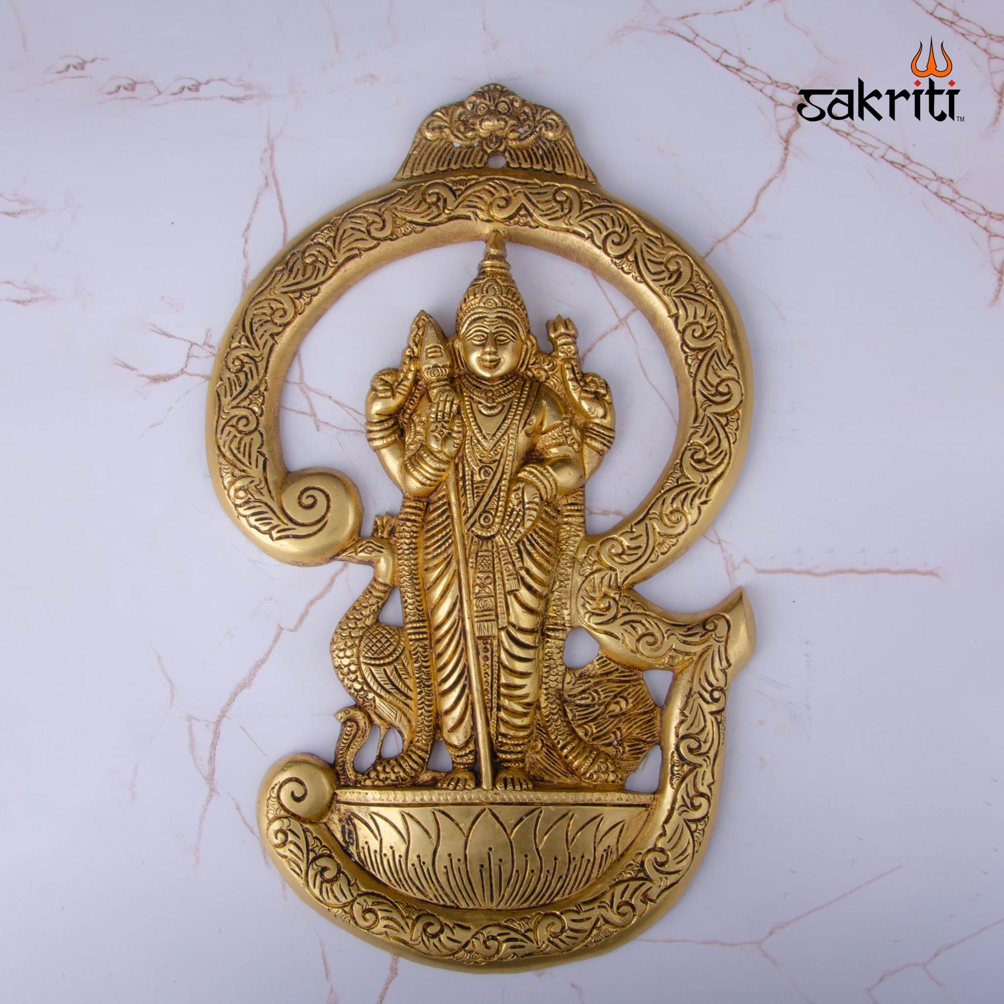 Elevate your spiritual space with this Brass Murugan Hanging Idol, a beautifully handcrafted wall sculpture of Lord Muruga. Standing 13.7 inches tall, this piece showcases the divine Murugan holding his Vel in a traditional posture. Made from premium solid brass, the intricate detailing highlights traditional South Indian craftsmanship. Perfect for home pooja rooms, meditation areas, or temple walls, this idol adds both spiritual significance and artistic elegance. It also makes an auspicious gift for festivals, housewarmings, and devotional occasions.